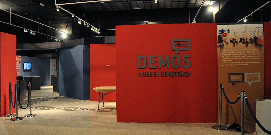 DEMOS. VIURE EN DEMOCRÀCIA mostra un conjunt d’uns 80 d’objectes patrimonials procedents del Museu d’Arqueologia de Catalunya, Museu Nacional d’Art de Catalunya, Museu del Àgora i del Museo Arqueológico Nacional de Madrid. El discurs museogràfic incorpora 4 audiovisuals creats per l’Institut del Teatre que amb escenes teatralitzades fan èmfasi en les circumstàncies claus dels quatre casos plantejats.