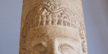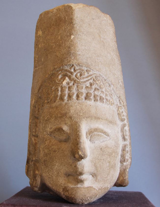 Cap d’una escultura de mida natural. La dama porta una mitra cònica coberta per un vel. Santuari del Cerro de los Santos, Montealegre del Castillo, Albacete. Pedra calcària. 400-200 aC. 285 × 135 × 155 mm. Museu del Castell de Peralada (Núm. reg. 6654). Foto: Museu del Castell de Peralada