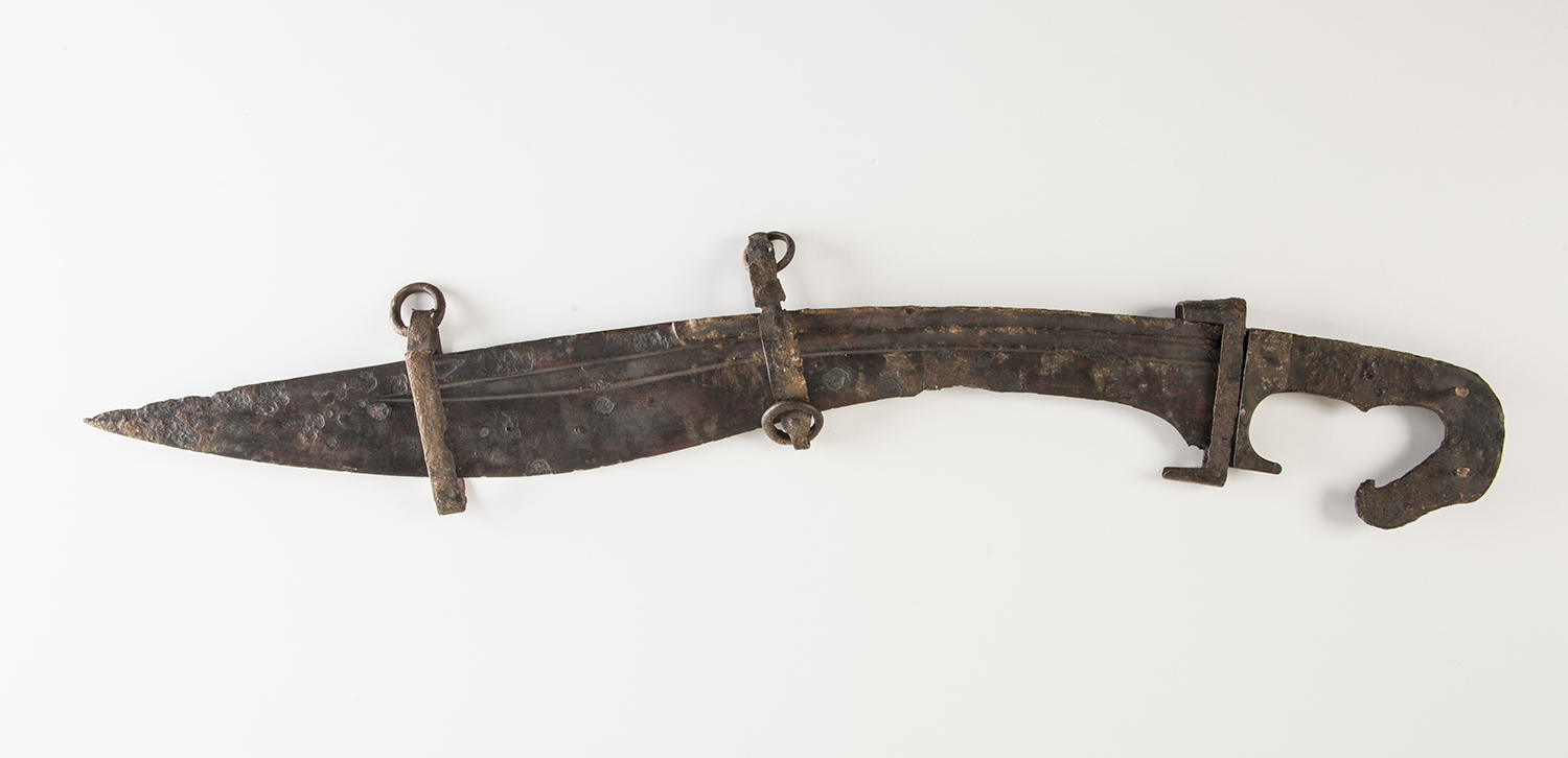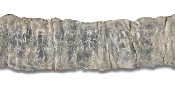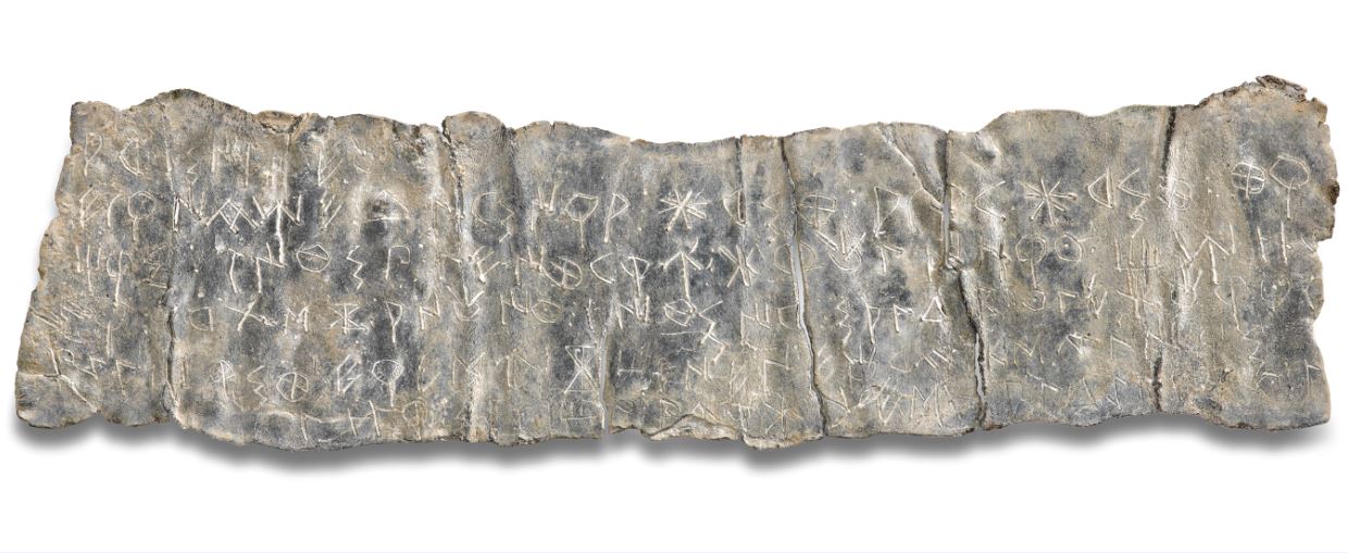 Inscripció sobre làmina de plom, possible carta comercial. Té forma rectangular allargada, amb contorns irregulars, i probablement va estar enrotllada en nou plecs. Puig de Sant Andreu, Ullastret, Baix Empordà. Plom. 300-200 aC . 40 × 155 mm . Museu d’Arqueologia de Catalunya - Ullastret (Núm. reg.: MAC ULL-03309), Foto: Josep Casanova